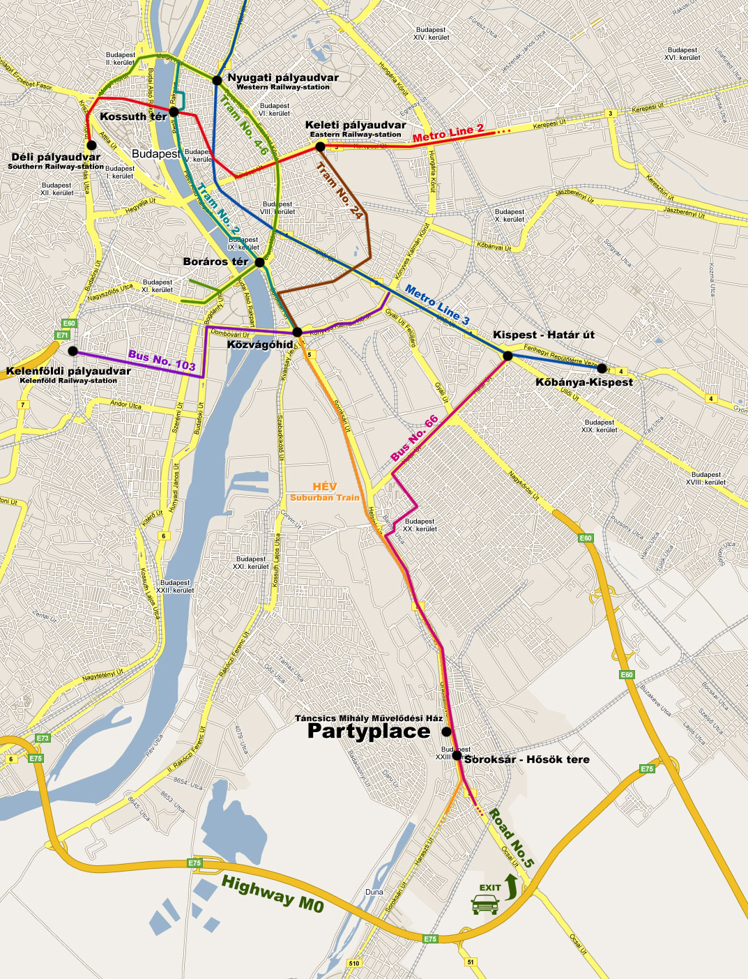 Getting to the partyplace is easiest with the suburban train ("HÉV") to Ráckeve, which starts from the Közvágóhíd (the Pest-end of the Lágymányosi bridge). You have to get off at the stop called Soroksár - Hősök tere, where every train stops. After getting off the stops, you have to go back ca. 300m-s, you can find the place at the other side of the Grassalkovich street. You can buy tickets from the conductor on the train, or at the traffic office at Közvágóhíd. (The latter is a bit cheaper.)